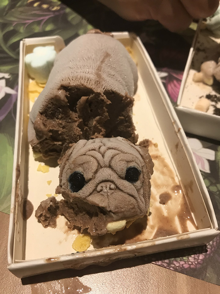 Meskipun berupa es krim, detail anak anjing yang mereka buat sangat sempurna. Jadi kaya anak anjing beneran, lengkap dengan mata berbinarnya. Duh jadi nggak tega makan.