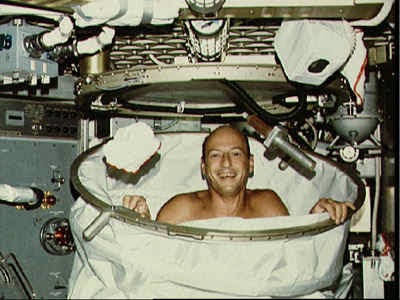 Pernah ngebayangin gimana mereka mandi? Pastinya nggak bisa pake banyak air kaya di bumi, jadi mereka cuma bisa membasuh muka dan badan selama berada di luar angkasa. Kalau tinggalnya berbulan-bulan, bisa dikira-kira sendiri ya, lengketnya badan kaya apa.