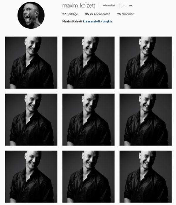 Maxim Kaizett yang merupakan anggota grup hip hop K.I.Z langsung punya ribuan pengikut dalam beberapa bulan. Memang nggak seberapa buat seorang selebriti, tapi akun Maxim jelas punya keunikan tersendiri. Kalau selebriti lain biasanya memuaskan para fans dan pengikutnya dengan membanjiri akunnya yang berisi berbagai konten menarik, Maxim benar-benar hanya mengandalkan satu foto yang sama yang diunggahnya setiap hari tapi dengan berbagai caption yang berbeda.