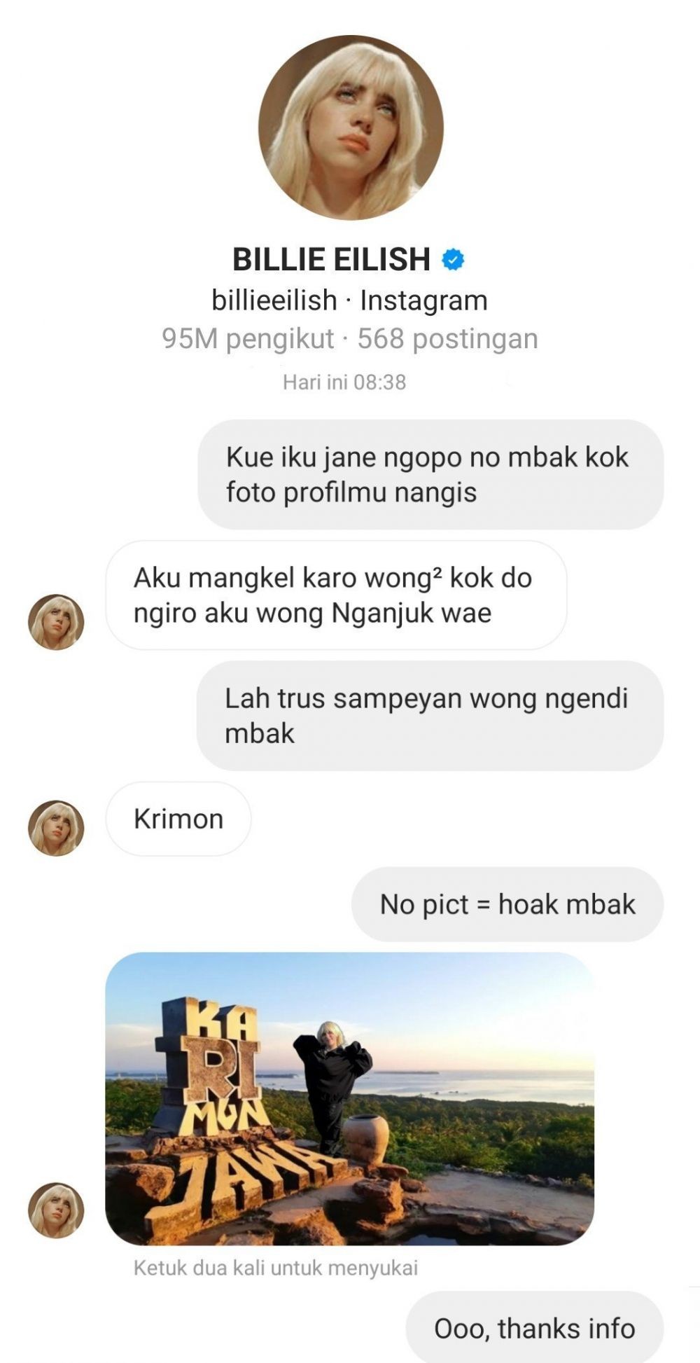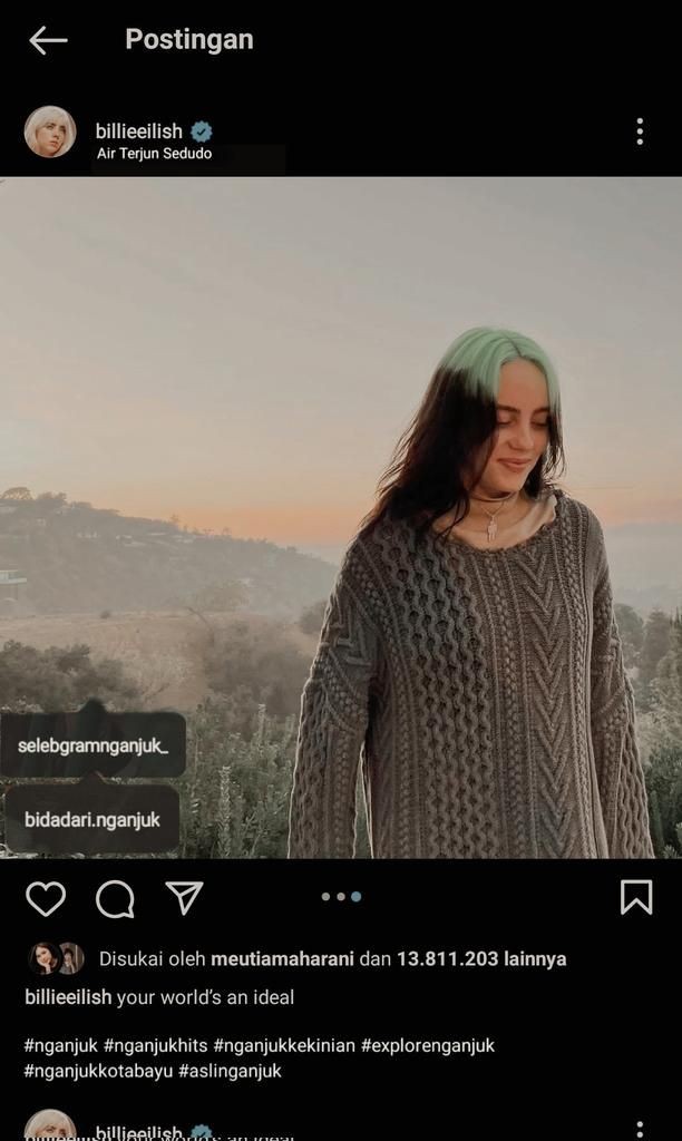 Beberapa waktu lalu media sosial digegerkan dengan banyaknya foto 'bukti' Billie Eilish asli orang Nganjuk, Jawa Timur. Mulai dari tangkapan layar Story dan DM Instagram, laman Wikipedia, hingga foto aktivitas Billie.