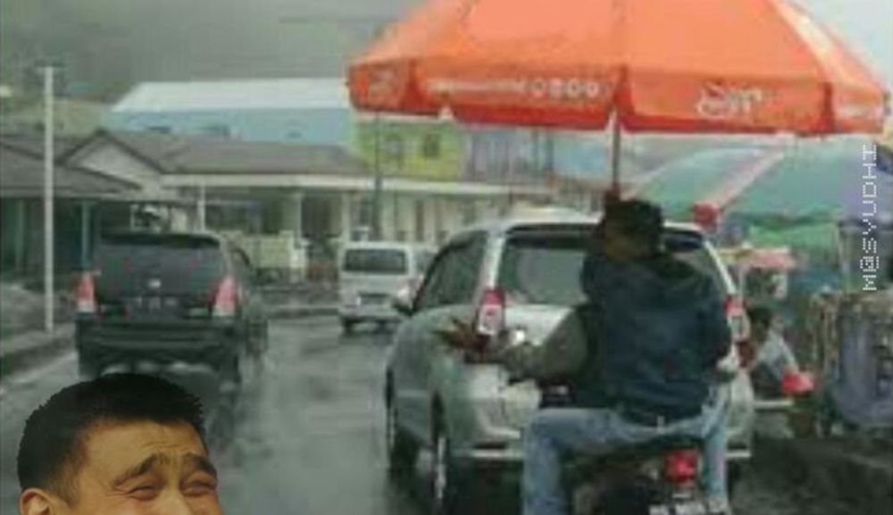 Nah pepatah itu mungkin cocok banget dengan potret dibawah ini. Saking antipasinya bahkan bisa dibilang nyeleneh karena menggunakan payung dengan tidak pada umumnya.