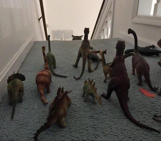 Daripada dianggurin, mainan dinosaurus ini dimanfaatin aja buat seru-seruan sama kucing.