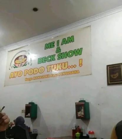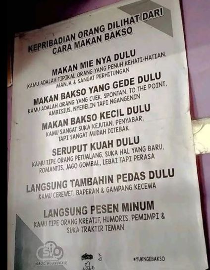 Yang Penting Heppiii. Kayanya hampir semua orang Indonesia pernah makan bakso dong ya. Selain rasanya yang enak dengan kuah yang gurih, harganya yang cukup murah, jadi alasan makanan asli Indonesia satu ini jadi favorit banyak orang. Nggak cuma itu, di warung bakso, biasanya ada tulisan-tulisan lucu yang bikin kamu nyengir bacanya. Penasaran kaya apa? Yuk langsung lihat potretnya berikut.