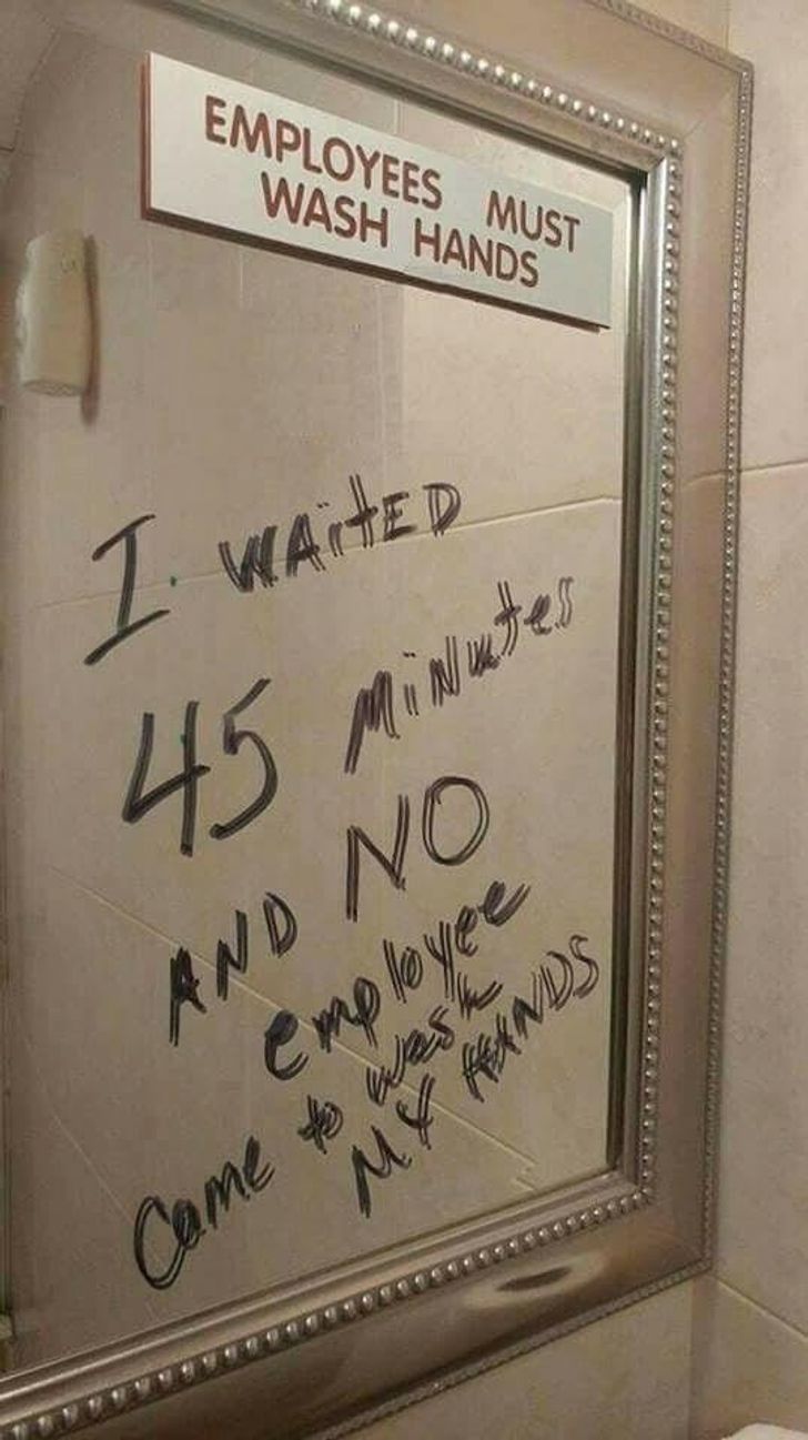 Katanya ada karyawan yang harus nyuciin tangan, udah nunggu 45 menit nggak ada yang nongol juga.