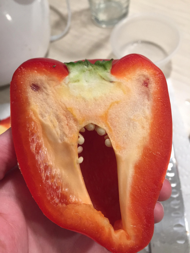 Yang Penting Heppiii. Yang sering banget di dapur pasti tahu deh kalau beberapa bahan makanan mentah bisa berubah nyeremin. Paprika misalnya, coba belah di tengahnya persis, bakal kelihatan ngeri banget, udah kaya hantu-hantu di film horor. Scroll ke bawah deh kalo masih ragu, berikut ini 3 paprika yang paling serem, hati-hati kebawa mimpi ya.