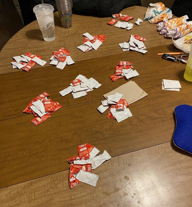 Ya gini kalau cuma ngomong, “Minta saos yang banyak.” Dikasih 98 biji, bingung.