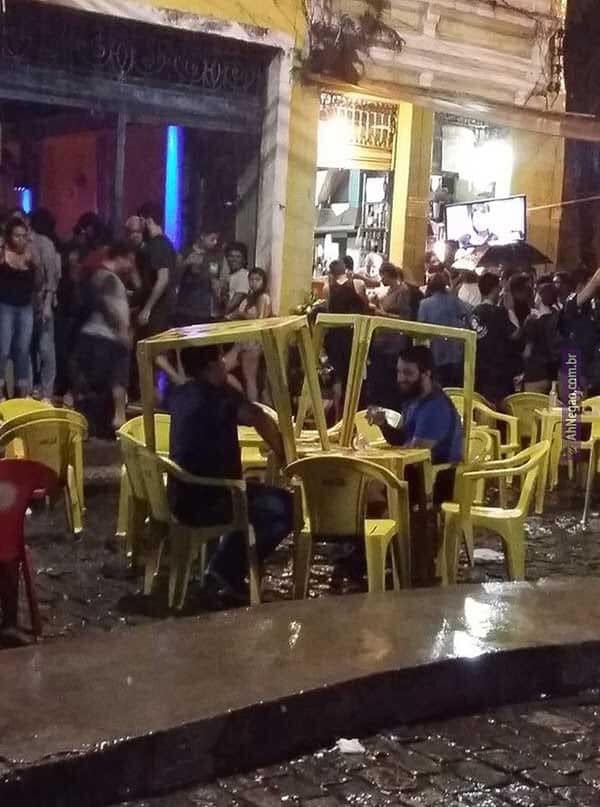 - Orang-orang pada cari tempat teduh. Dua pria ini menggunakan akalnya biar nggak kehujanan.