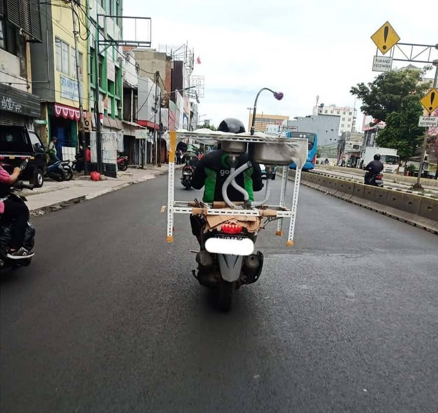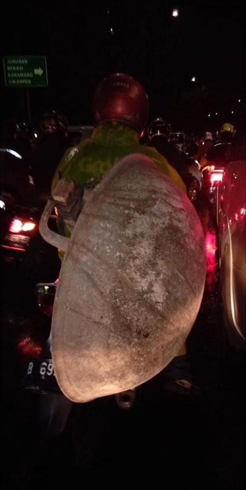 Siapa nih order kuali raksasa malah pake ojol motor? Pake mobil kek.