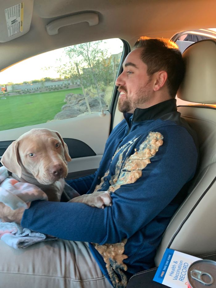 Baru adopsi anak anjing, langsung dimuntahin. Hahaha.