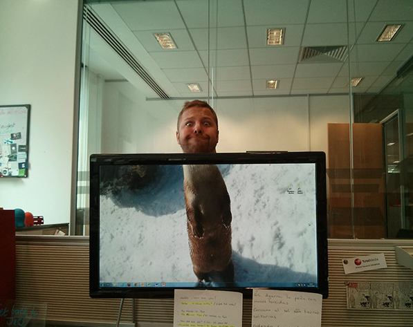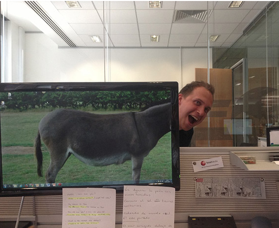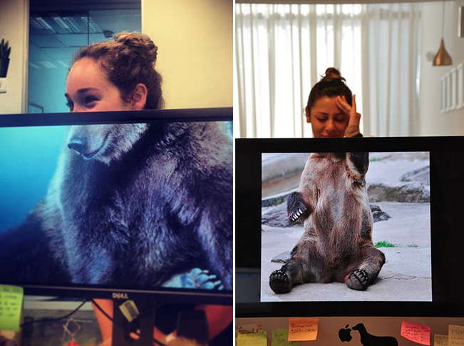 Yang Penting Heppiii. Kerja kantoran emang kadang bikin jenuh. Duduk lama di depan laptop, dengerin curhatan temen yang nggak ada habisnya, sampe nggak ada benernya di mata bos, bikin kepala mau meledak. Nah, untuk menyiasati kejenuhan tersebut, banyak cara yang bisa dilakukan, termasuk ngelakuin hal-hal kocak tapi kreatif. Kaya karyawan kantor yang lagi gabut berikut ini. Mereka berinisiatif gabungin wallpaper komputer bergambar hewan dengan kepala mereka sendiri, hasilnya kocak banget.