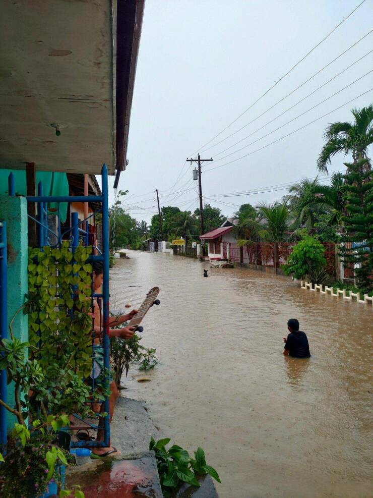 Udah tahu banjir, masih pengen main skateboard juga, uji nyali kayanya ya?