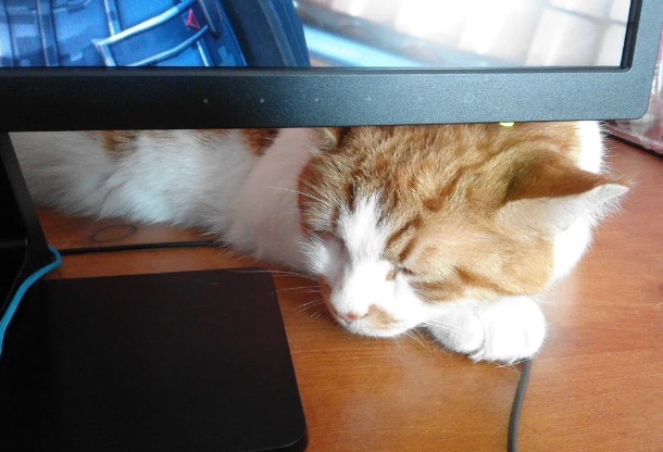 Jika kita fokus pada sesuatu, kucing biasanya akan datang tanpa diminta. Misalnya, orang-orang seperti berikut ini sedang bekerja. Kucing itu bisa tiba-tiba naik ke meja dan tetap diam di bawah monitor.