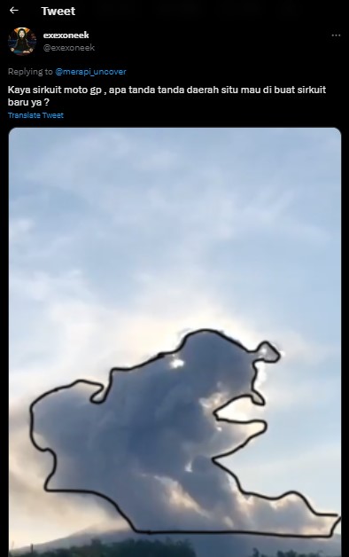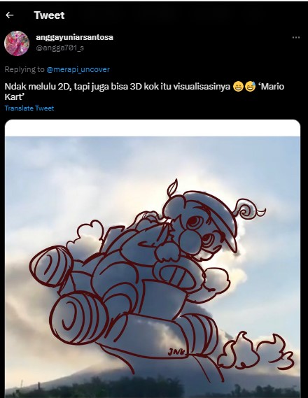Gunung Merapi terletak di perbatasan Jawa Tengah dan Yogyakarta belakangan mengalami peningkatan aktivitas. Erupsi merapi tercatat mengeluarkan awan panas atau yang biasa disebut wedhus gembel berulang kali. Menariknya, awan panas yang terbawa angin menghasilkan awan yang seolah punya bentuk dan makna beragam. Dalam hal ini netizen akhirnya berkreasi. Berbekal gambar gumpalan awan panas Gunung Merapi, berbagai kreasi kartun tercipta Yuk simak beberapa potretnya.
