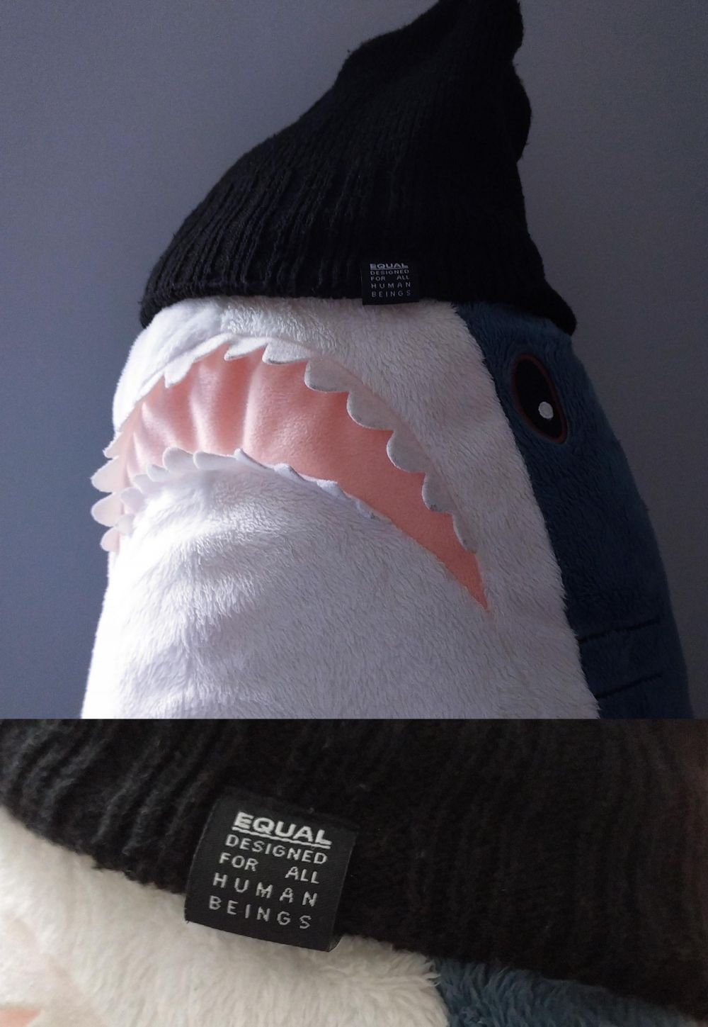 - Harusnya kupluk ini cuma dipakai sama manusia, tapi kok cocok sama boneka hiu ini, ya?