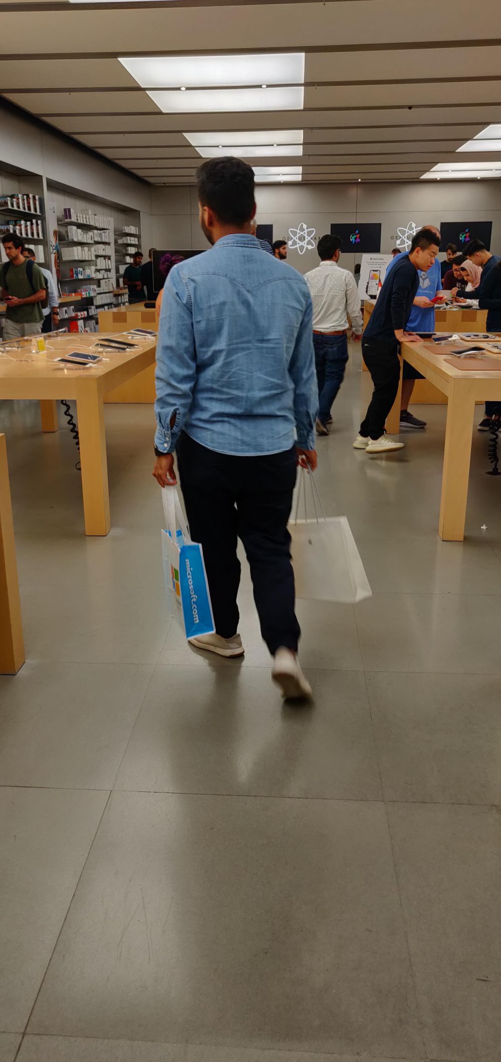 - Orang ini pergi ke Apple Store, tapi dia bawa tas Microsoft.