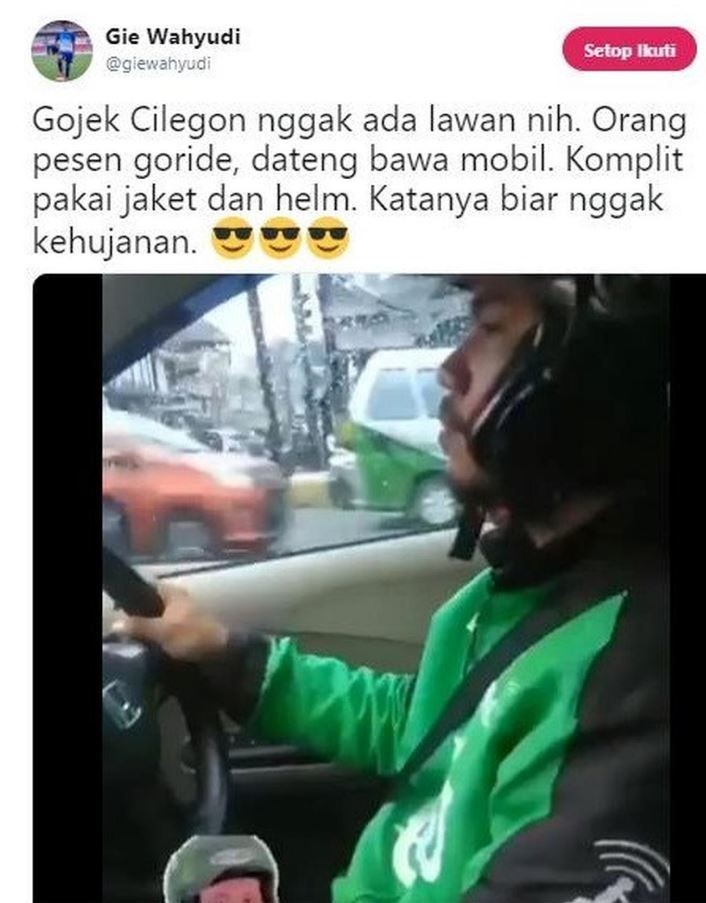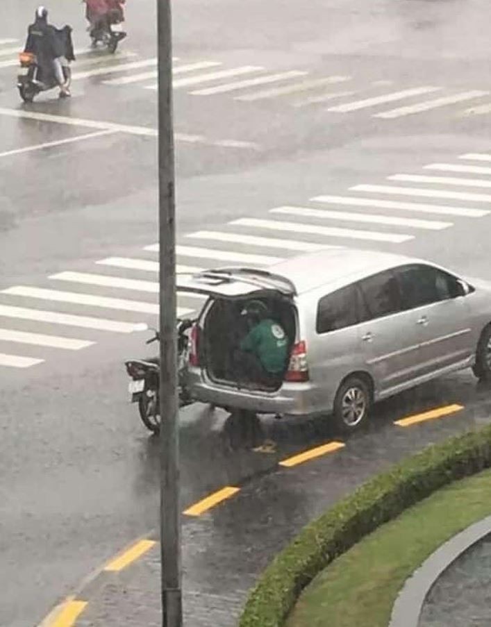 - Driver ojek online ini berteduh di bagasi mobil orang. Kira-kira mobilnya siapa, ya