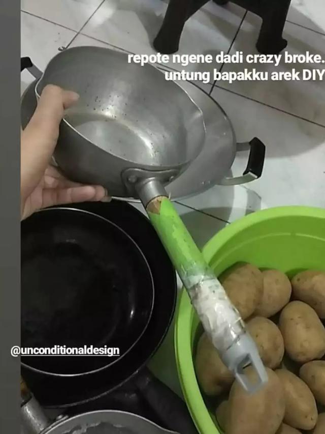- Meski gagang udah patah, ibu-ibu emang suka banget pakai panci yang udah agak penyok kaya gini.