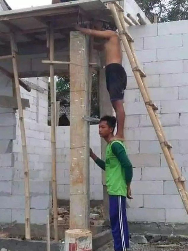 5. Gegara tangganya terlalu tinggi, jadi malah harus minjemin bahu buat tangga darurat