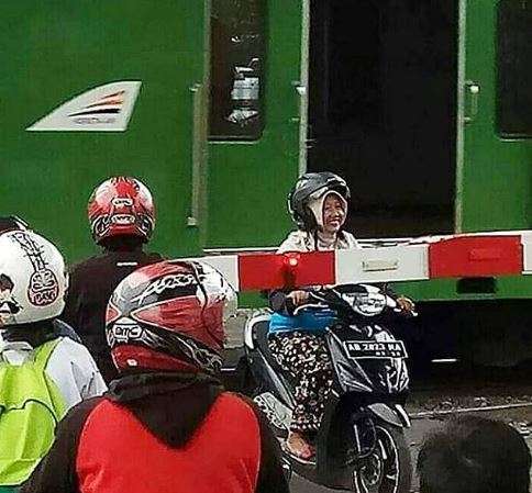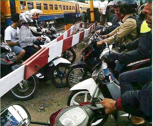 Yang Penting Heppiii. Perlindungan terhadap pengguna jalan dari lalu-lalangnya kereta api ada di palang pintu. Palang pintu kereta dibuat agar para pengendara motor dan mobil berhenti sejenak untuk mendahulukan laju kereta api, ini sikap logis dan masuk akal. Kenyataannya seringkali malah sebaliknya, bukannya berhenti dan sabar nunggu kereta lewat, banyak orang yang nekat melaju walau palang pintu sedang dalam proses turun. Akibatnya, nggak sedikit yang nyangkut di tengah palang pintu. Kaya di bawah ini beberapa contoh yang tertangkap kamera. Hayo lo, malu nggak tuh?