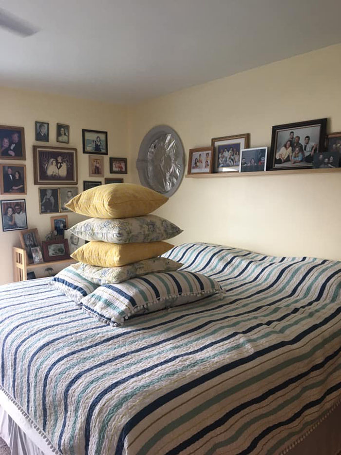 Joanne kemudian meminta suaminya untuk menata tempat tidur setiap hari. Tapi tampaknya, bantal-bantal ekstra membuat Jim bingung. Joanne pun kesal dengan kebingungan Jim. Tetapi alih-alih frustrasi, dia mengubah situasi yang membingungkan menjadi permainan lucu 'apa yang akan dilakukan Jim dengan bantal-hari ini' sebagai gantinya. "Dia melakukannya dan mulai bermain dengan bantal untuk membuatku tertawa," Joanne berbagi. Kamu harus lihat bagaimana bantal-bantal itu ditata Jim setiap hari.