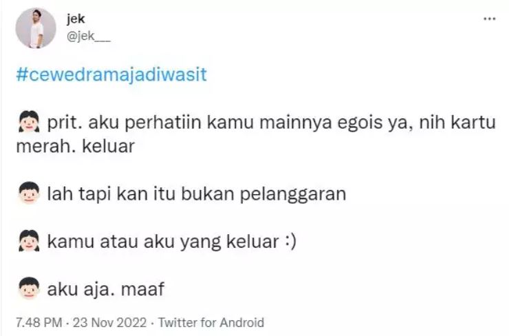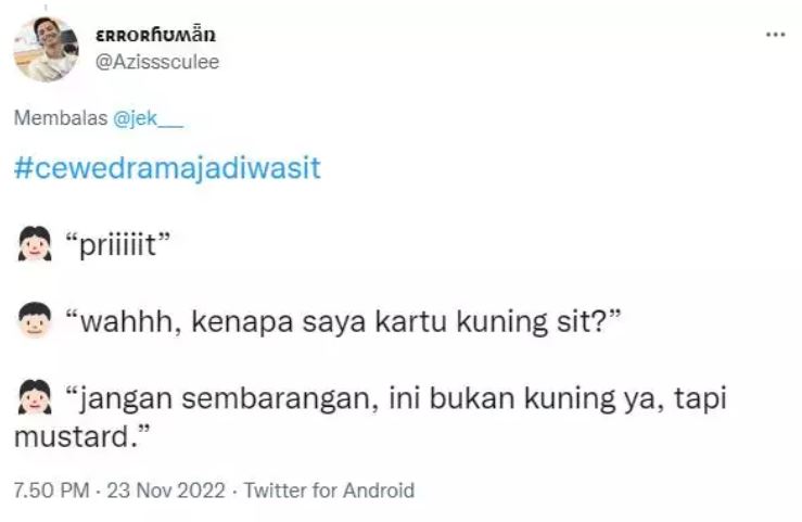 Yang Penting Heppiii. Dalam dunia sepak bola, peranan wasit sangatlah penting agar jalannya pertandingan tetap fair play dari awal hingga akhir. Tugas wasit juga nggak ringan, siap-siap disemprot pemain atau diprotes tim official maupun penonton. Karena itu, mayoritas wasit adalah pria, walaupun mulai ada beberapa wasit cewek di lapangan. Tapi karena perempuan, maka peluang untuk bapernya lebih besar. Dan saking pahamnya akan hal itu, netizen punya khayalan versi mereka andai perempuan jadi wasit.