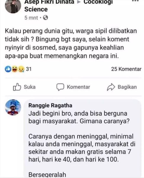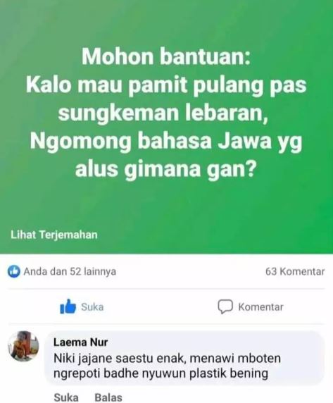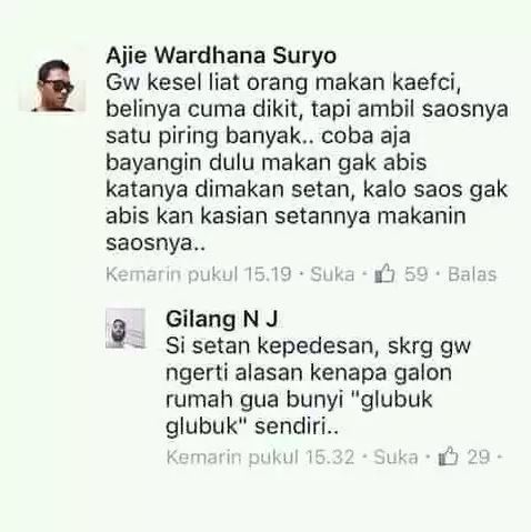 Yang Penting Heppiii. Bukan hal baru kalau media sosial juga digunakan netizen untuk mencari jawaban atas hal apapun yang pengen mereka ketahui. Karena itu, seringkali mereka nggak ragu melontarkan pertanyaan di ruang publik dunia maya seperti media sosial. Tapi dasar netizen +62, jawaban yang dikasih nggak mungkin lurus dan bener. Kaya jawaban-jawaban ngasal di status Facebook berikut ini, ngakak bacanya.