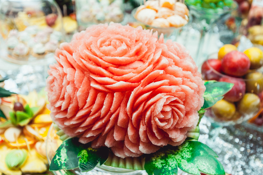Ukiran bunganya detail banget. Butuh berapa lama ya bikin bunga semangka yang cantic ini ?