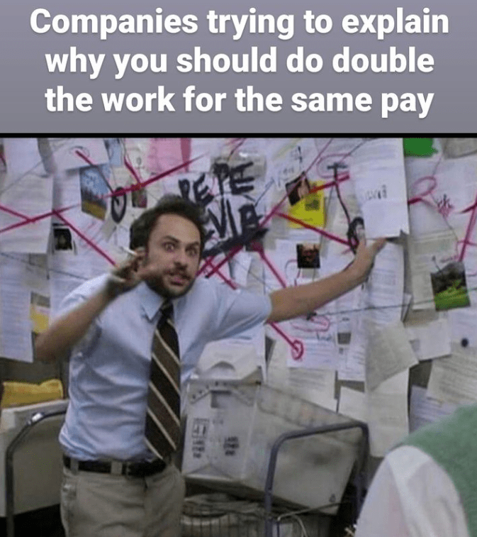 Muka orang kantor yang coba jelasin kenapa kerjaan nambah, tapi gaji tetap.