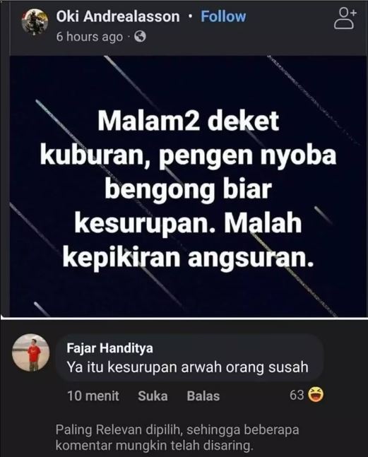 Yang Penting Heppiii. Di media sosial, kita dapat dengan mudah menemui berbagai jenis orang. Ada yang sangat cerdas, ada yang sangat menyenangkan, dan ada juga yang terlalu absurd. Tipe orang yang terakhir ini bisa jadi menjengkelkan atau lucu, tergantung dari sudut pandang kita. Kalau kamu belum pernah ngalamin atau melihat orang-orang absurd seperti ini, coba intip status lucu yang sangat absurd warga Facebook di bawah ini.