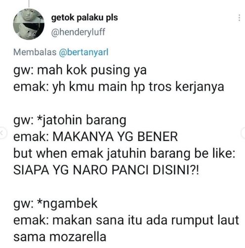 Yang Penting Heppiii. Cara didik setiap orang tua berbeda kepada setiap anaknya. Tapi mungkin kita bisa sepakat kalau orang tua Indonesia punya logika yang cukup nyleneh dalam mendidik anak-anaknya, terutama angkatan lama. Kita yang udah pada gede aja, masih sering dimarahi kaya anak kecil, bener nggak? Atau zaman dulu, sering banget dikasih omongan yang nggak masuk akal, tapi namanya orang tua, nggak bisa didebat. Coba lihat curhatan netizen tentang logika orang tua mereka di bawah ini, kocak banget.