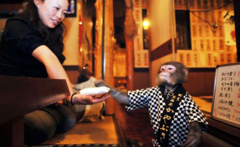 Restoran di Tokyo ini ternyata pelayannya adalah dua ekor monyet bernama Yat-chan dan Fuku-chan. Mereka berdua sudah memiliki sertifikat kerja dan upahnya dalam bentuk kacang kedelai lho!