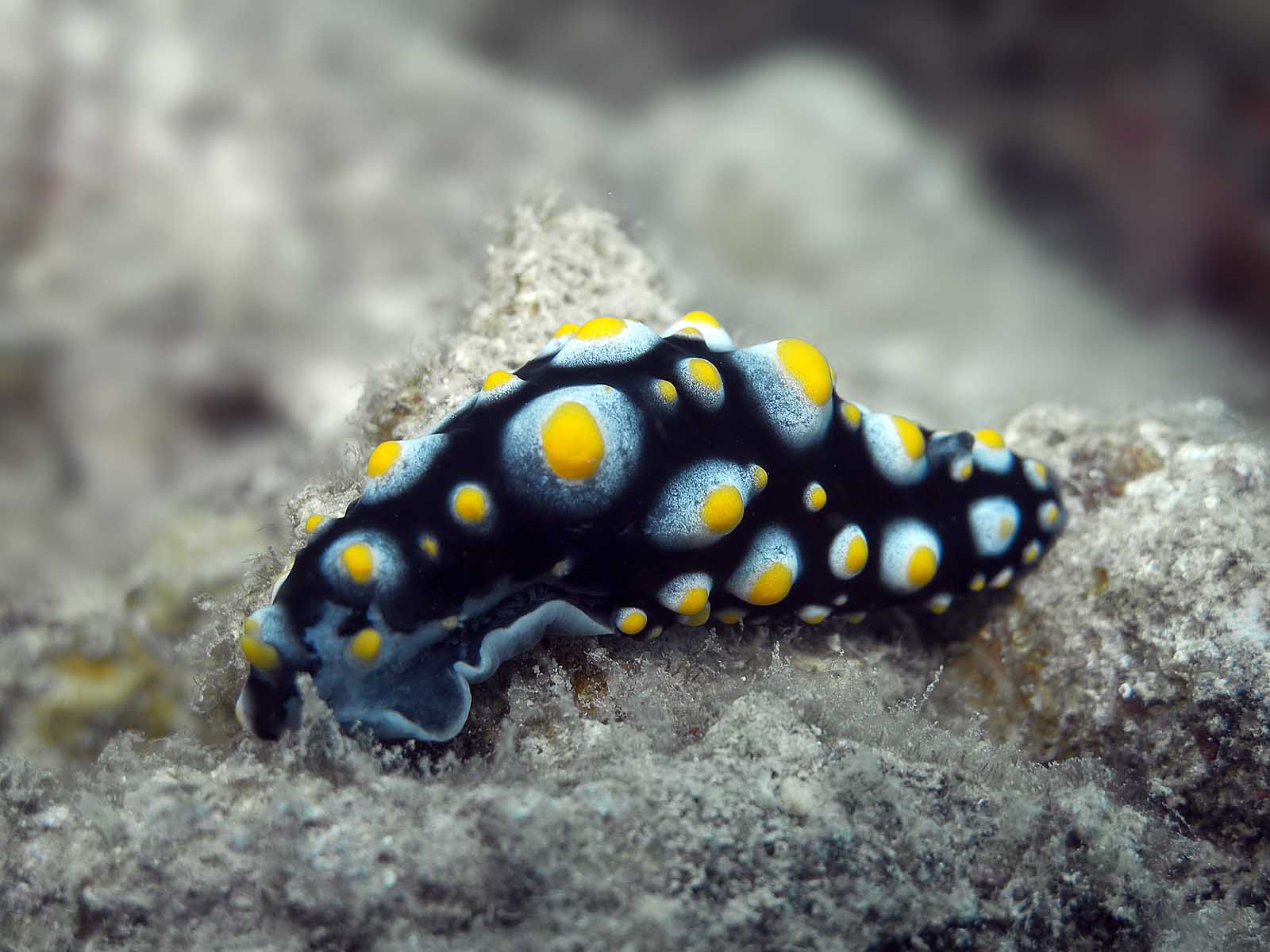 Termasuk siput laut tanpa kulit yang langka. Punya warna yang menarik antara putih, oranye, dan biru menyala.
