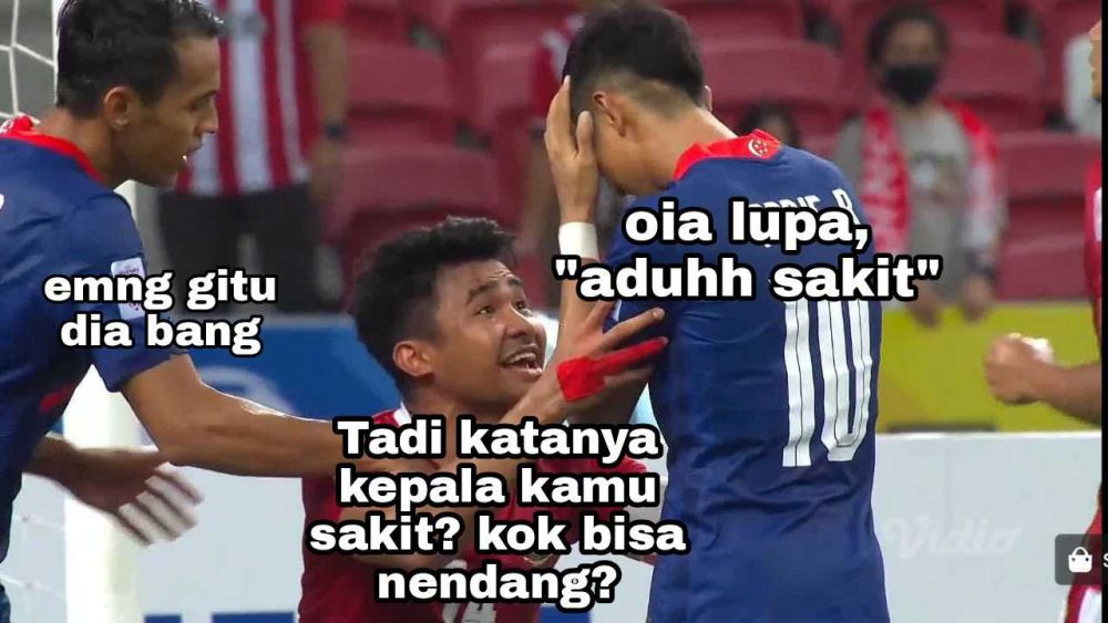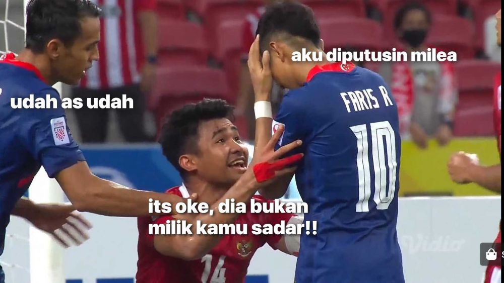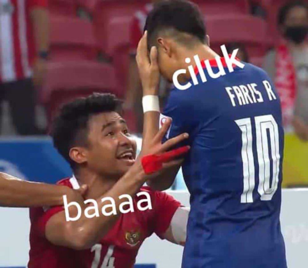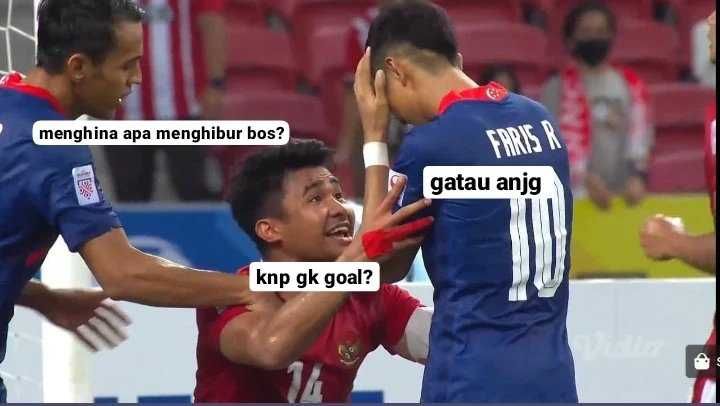 Semi final Piala AFF 2020 yang berlangsung antara Timnas Indonesia melawan Singapura pada leg kedua memanas penuh drama, sebelumnya pada leg pertama berakhir imbang 1:1. Salah satu momen yang disoroti saat pertandingan leg kedua, yakni ucapan Asnawi kepada Faris Ramli ketika gagal pada tendangan pinalti di menit ke-90. Pasalnya potret tersebut cepat berkembang di dunia maya, dan banyak warganet membuat meme adegan tersebut nih dengan kocak, penasaran? yuk disimak gambar dibawah ini!