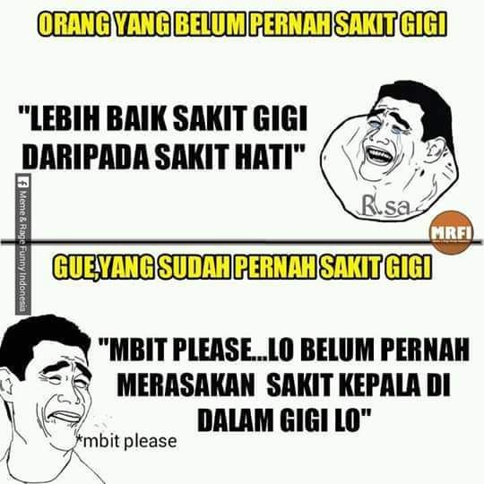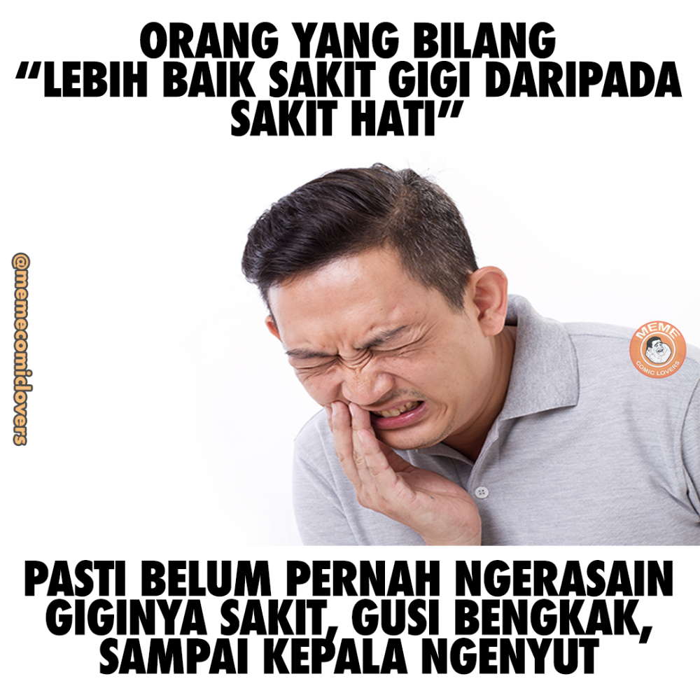 Yang Penting Heppiii. Buat kamu yang lagi ngalamin sakit gigi, pasti setuju kalau jangan sampai terulang lagi. Emang mending sakit hati sih daripada sakit gigi, karena memang sesakit itu. Nah buat kamu yang belum pernah ngalamin sendiri, mungkin meme berikut ini bisa ngasih kamu gambaran gimana rasanya sakit gigi. Mendadak rajin gosok gigi deh. Simak kuy.