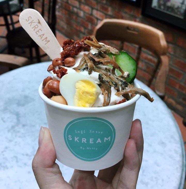 Tapi ternyata di Malaysia, ada sebuah produk es krim bernama Skream Softserve yang menjual es krim dengan rasa nasi lemak. Bahkan disajikan dengan lauk yang sama persis dengan makanannya. Kebayang donk gimana rasanya tuh es krim.