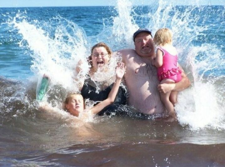 - Foto keluarga dengan latar laut gagal total karena kaget terkena ombak.