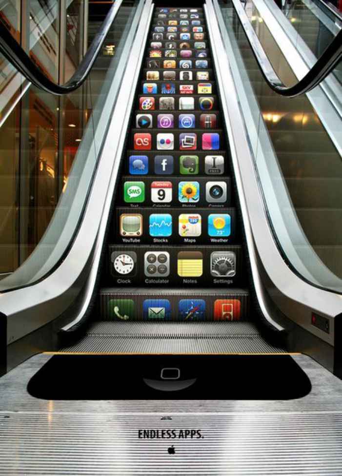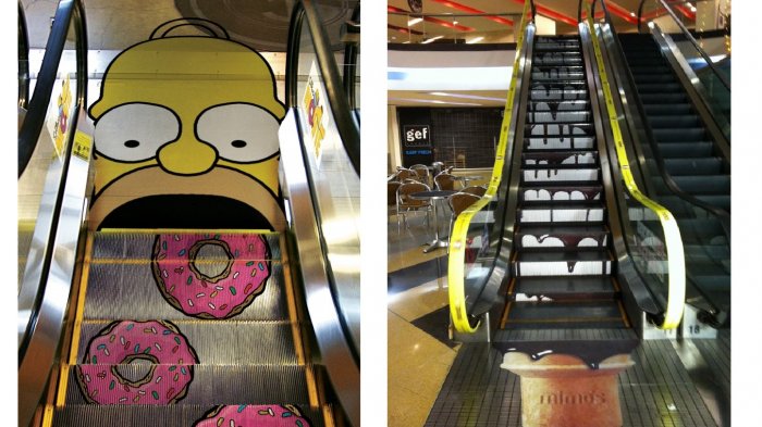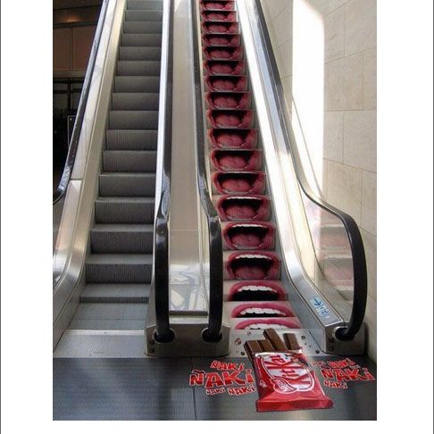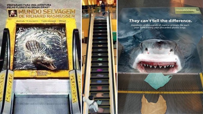 Yang Penting Heppiii. Setiap pergi ke mall, kamu pasti naik eskalator atau lift. Nah, sebagai salah satu akses yang sering digunakan, eskalator juga sering dijadiin tempat masang iklan produk. Untuk menarik perhatian, dibuatlah sedemikian rupa. Nah, ini beberapa iklan dengan desain kreatif di eskalator.