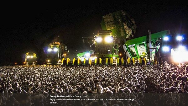 Diliat sekilas atau bahkan beberapa detik foto ini kaya lagi seru banget konser yang dipadetin sama banyak orang, tapi coba diliat lagi! Ini tuh foto kapas yang lagi dipanen pakai traktor loh!