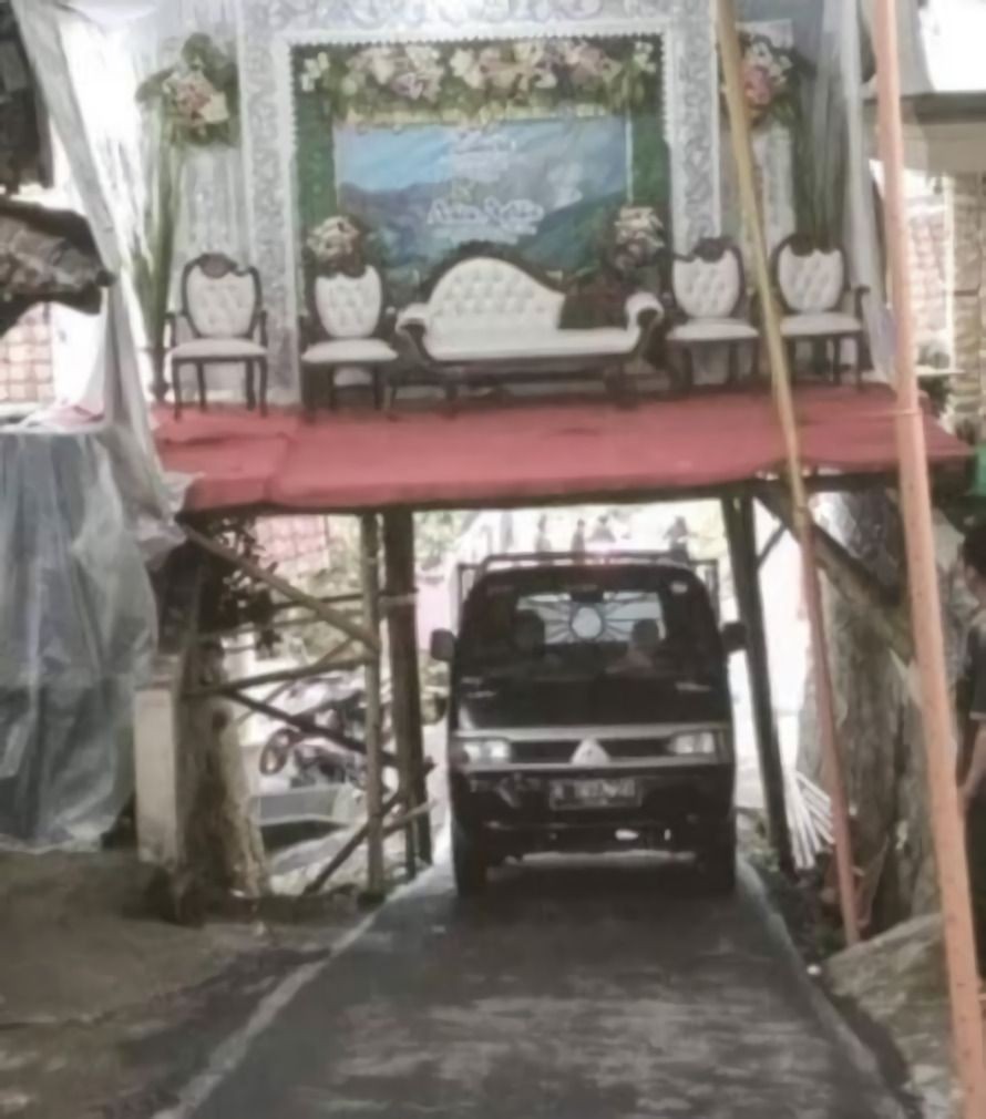 Untung masih bisa lewat, walaupun resikonya ketimpa pelaminan.