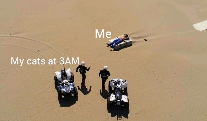 Lalu muncullah berbagai meme kocak seperti ini. Cuma pemilik kucing yang punya keresahan ini. Jam 3 pagi adalah jam-jam rawan untuk terbangun karena lompatan kucing.