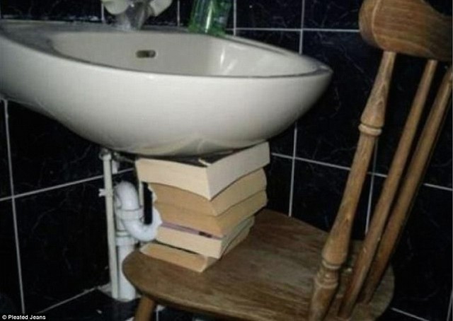 2. Selain buat dibaca, ternyata buku banyak manfaatnya, salah satunya buat nahan wastafel biar ga jatuh.