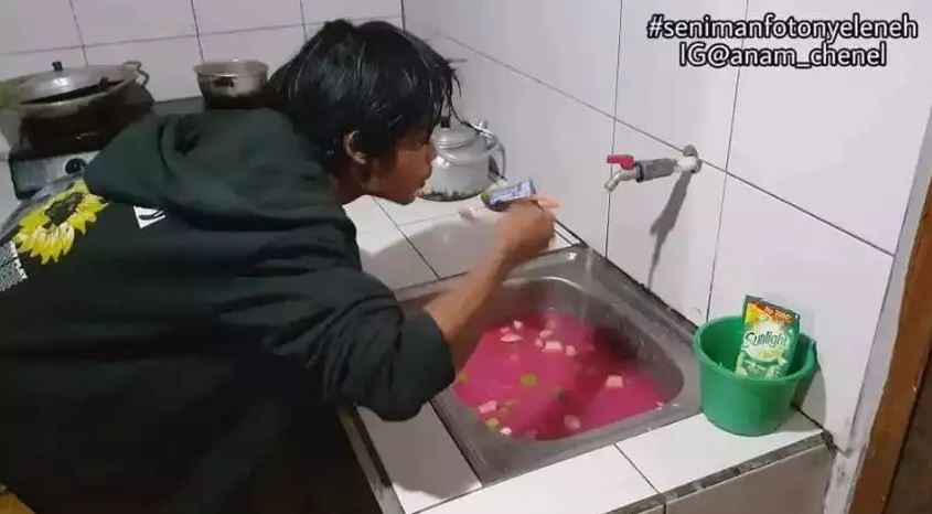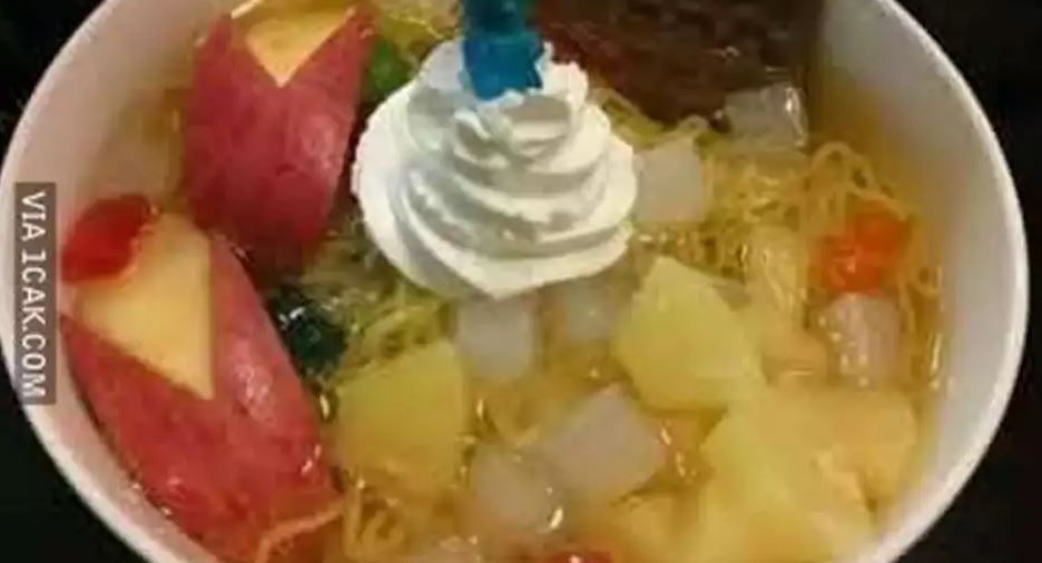 - Es buah pakai mi goreng, rasanya bakalan kayak apa ya?