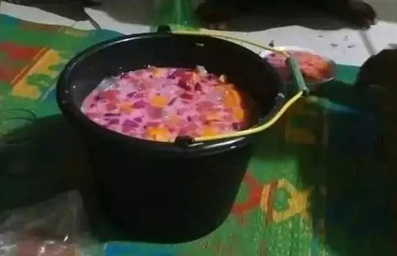 - Es buah pakai ember. Sensasi segar buah-buahan yang bercampur lumut.
