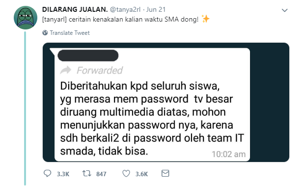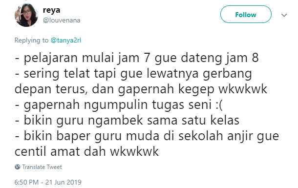 Bayak yang bilang masa SMA adalah masa yang paling indah. Nyatanya, pernyataan ini dibuat bukan tanpa alasan. Banyak momen-momen seru yang tercipta saat masa SMA. Salah satunya, adalah momen-momen kenakalan-kenakalan. Perbuatan inilah yang kelak terkenang dan sering diceritakan kepada teman kuliah, bahkan mungkin anak cucu nanti. Seperti deretan curhatan warganet twitter dibawah ini yang bakal bikin kamu kangen masa SMA.