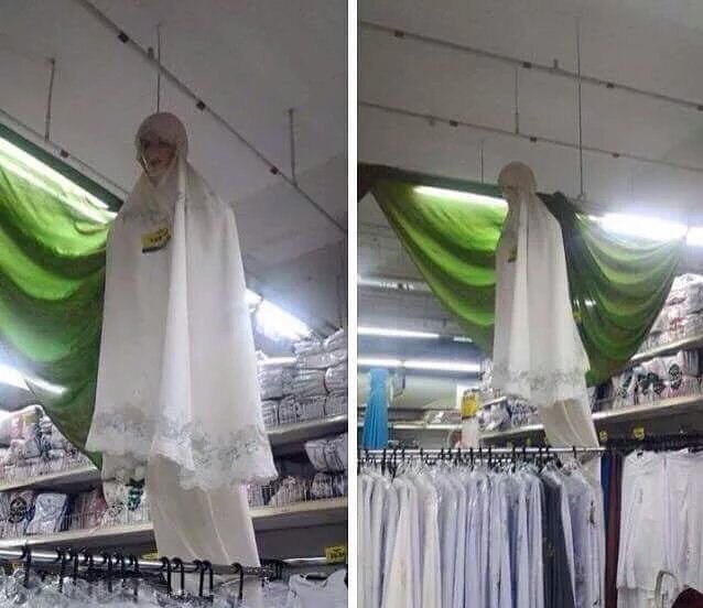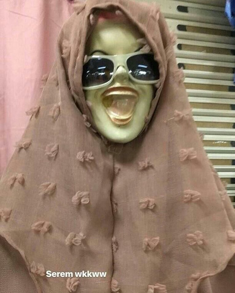 - Hmm, jualan kerudung biar kelihatan perlu digantung