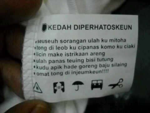 Selain informasi penting tersebut, terkadang label ini berisi tulisan yang nyeleneh lho. Coba deh kamu perhatikan sekarang baju-baju yang kamu pakai. Ada nggak tuh tulisan yang unik di dalamnya? Kalau ada sih kamu kayaknya beruntung banget nih..