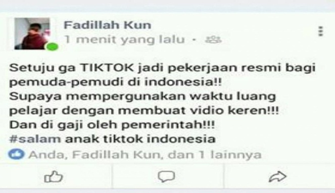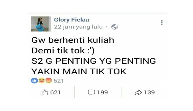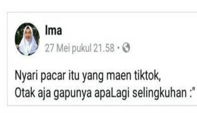 Yang Penting Heppiii. Kemunculan aplikasi bernama Tik Tok ngasih warna baru dalam dunia media sosial, dan jadi demam baru di berbagai kalangan. Gimana nggak, hampir semua orang bikin konten semenarik mungkin agar mencapai FYP di Tik Tok. Bahkan, banyak juga yang kecanduan dan menjadi fans garis keras dari aplikasi ini. Sampai-sampai mereka membuat pernyataan epic tentang Tik Tok, kaya beberapa yang ada di bawah ini. Simak deh, kocak juga loh.