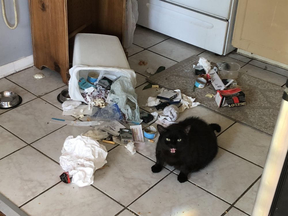 - Kucing ini ngamuk gara-gara si majikan telat ngasih dia makan, sampah ditumpahin semua!