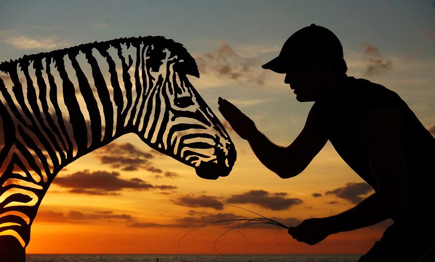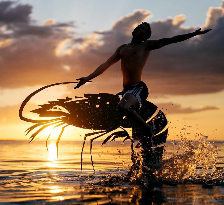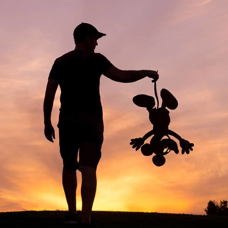 John datang dengan cara kreatif, menggabungkan lembaran-lembaran kardus dan matahari terbenam. Pria itu membuat guntingan yang cermat dan menggunakannya sebagai alat bantu untuk mengambil semua jenis foto kreatif - dan bahkan menambahkan komentar lucu untuk setiap foto! John menyebutnya "Sunset Selfies". Sunset Selfies pasti akan membuatmu tersenyum.
