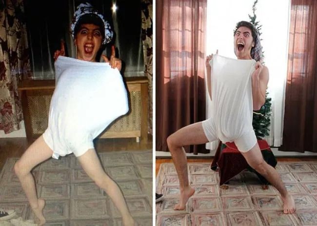 Mungkin kamu dan keluarga masih memiliki foto keluarga zaman dulu, Di mana saat itu kamu masih kecil dan orangtua masih muda banget. Gimmana ya kalau foto keluarga jadul itu dipotret ulang dengan pose yang sama? Seru banget deh. Tapi jangan sampai kaget ya kalau perbedaanya bikin ngakak hehehe